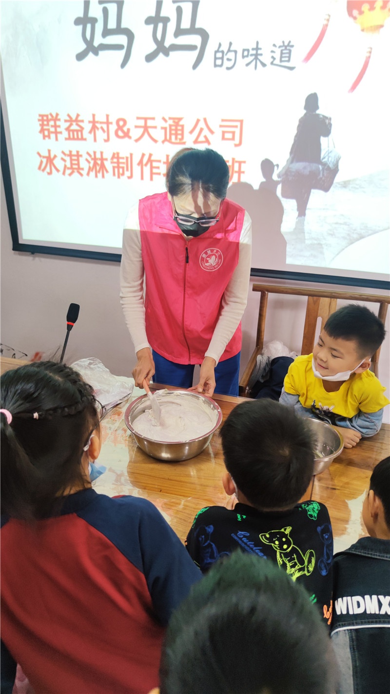 提及冰淇淋,现场的小朋友一个个兴奋得欢呼雀跃。商场里出售的冰淇淋中多含有较多的添加剂,如何给孩子制作一款无添加剂的冰淇淋成了这堂亲子互动课的目的。群益村美食老师现场讲解打发鸡蛋及鸡蛋牛奶混合液的过程,演示打发淡奶油、搅拌混合,加入果酱等改变口味的方法和分装小瓶等步骤。期间大家认真听讲解,小朋友们眼睛牢牢地盯着讲台,仔细观察每一个步骤,还时不时地向美食老师发问,兴致高涨。孩子们一边品尝着冰淇淋,一边在自己的冰淇淋罐盒上贴上自己所爱口味的标签后让美食老师装满刚做的冰淇淋,跑前跑后忙得不亦乐乎!