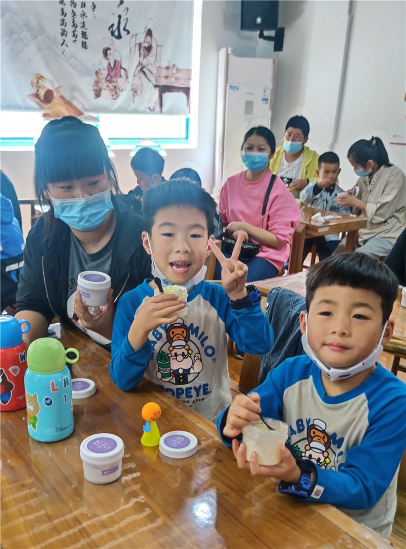 提及冰淇淋,现场的小朋友一个个兴奋得欢呼雀跃。商场里出售的冰淇淋中多含有较多的添加剂,如何给孩子制作一款无添加剂的冰淇淋成了这堂亲子互动课的目的。群益村美食老师现场讲解打发鸡蛋及鸡蛋牛奶混合液的过程,演示打发淡奶油、搅拌混合,加入果酱等改变口味的方法和分装小瓶等步骤。期间大家认真听讲解,小朋友们眼睛牢牢地盯着讲台,仔细观察每一个步骤,还时不时地向美食老师发问,兴致高涨。孩子们一边品尝着冰淇淋,一边在自己的冰淇淋罐盒上贴上自己所爱口味的标签后让美食老师装满刚做的冰淇淋,跑前跑后忙得不亦乐乎!