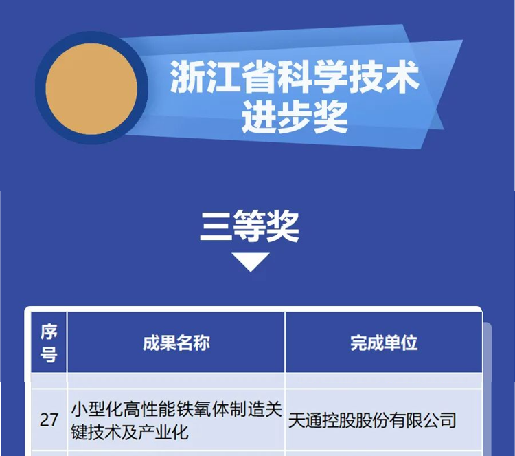 在7月11日下午召开的全省科技创新大会上,2021年度“浙江省科学技术进步奖”等一系列奖项揭晓,3118云顶集团控股股份有限公司“小型化高性能铁氧体制造关键技术及产业化”项目荣获浙江省科学技术进步奖三等奖。这是3118云顶集团公司磁性材料第八次获得浙江省科学技术进步奖。